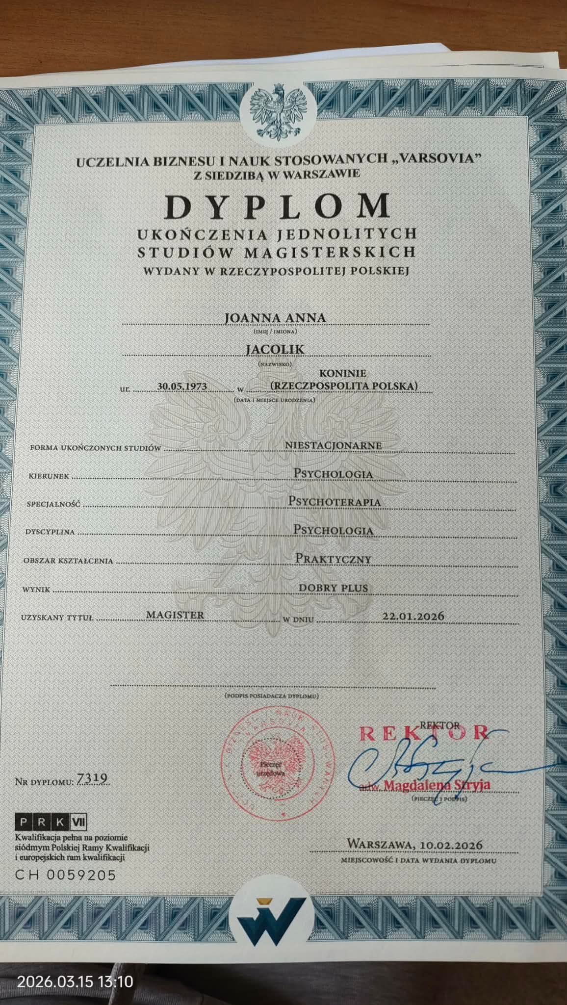 Jestem psychologie i psychoterapeutą nurtu CBT POZNAWCZO- BEHAWIORALNEGO.